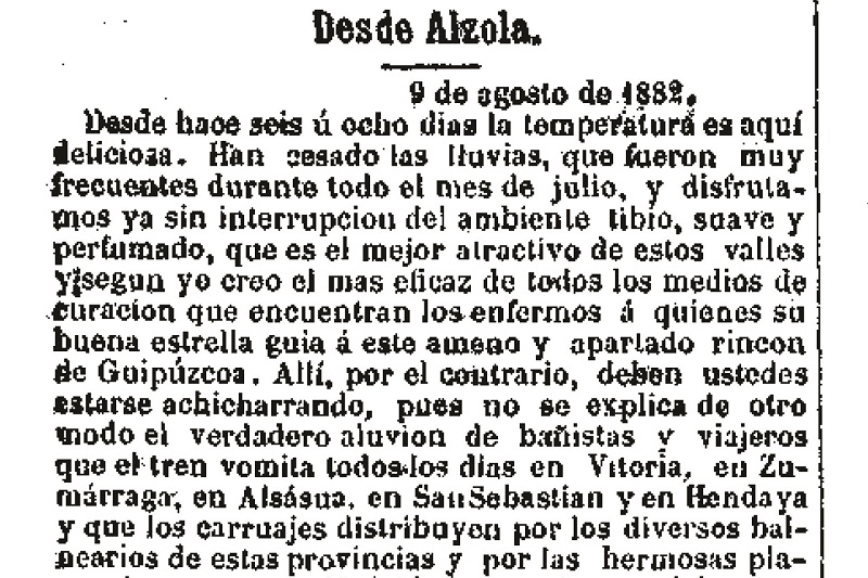 “Desde hace seis u ocho días la temperatura es aquí deliciosa. Han cesado las lluvias, que fueron muy frecuentes durante todo el mes de julio, y disfrutamos ya sin interrupción del ambiente tibio, suave y perfumado, que es el mejor atractivo de estos valles y según yo creo el más eficaz de todos los medios de curación que encuentran los enfermos a quienes su buena estrella guía a este ameno y apartado rincón de Guipúzcoa. Allí, por el contrario, deben ustedes estarse achicharrando, pues no se explica de otro modo el verdadero aluvión de bañistas y viajeros que el tren vomita todos los días en Vitoria, en Zumárraga, en AIsasua, en San Sebastián y en Hendaya y que los carruajes distribuyen por los diversos balnearios de estas provincias y por las hermosas playas de su costa. Madrid, a estas horas, debe estar despoblado”.